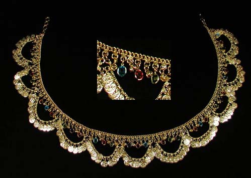 If you don't see what you're looking for, explore the other pages of this site: This belly dance belt with glass charms, bells and coins comes in Gold or Silver tone finish with transparent charms in blue, green, red, and yellow. Measures 36' for coin and charm part, with another 6' chain on one end and 4' on other end. Approx. 46' long. Also have a look at the matching head ornament #157, belly dance anklet #196, belly dance necklace #156 and belly dance head ornament #157. GOLD COINS: Won't play? Download here (566 K .wav) Belly dance belt. tribal belts, tribal belly dance belt, belly dance coin belt, beaded belly dance belts. Belly dance costume, belly dance hip scarf, belly dance zills, dancing swords, belly dance coin tops, belly dance choli tops, coin tops, harem pants, and belly dance jewelry.
