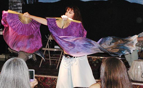 The evening started off with live drumming by Anubis and a new drummer, Cat, who is an active participant in the SCA and an awesome Middle Eastern drummer. The first round opened with Zarifa and Devi Safir, followed by the Gypsy Dancers, a troupe of eight of Zarifa's students in a beautifully choreographed troupe dance. The first round closed with Suzy Delatorre in a graceful and tantalizing sword dance to a chiftitelli based rhythm.