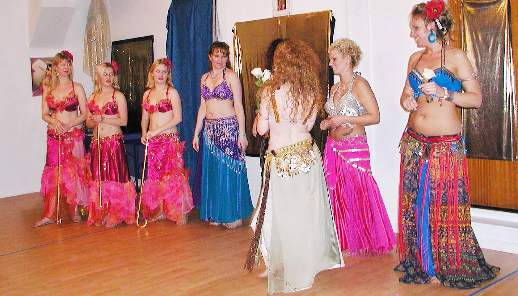 All dancers were called to the floor for curtain call to raucous applause from the audience that crowded the studio, each dancer receiving a single rose from Zarifa. During the space between sets dancers and spectators mingled; drummers tinkered with tablas and awaited the second show. Promptly at 7 PM, Devi Safir started off the second set with an energetic Egyptian style drum dance, followed by a lively Salsa-like belly dance to an African style rhythm by Isabella. Katana dazzled the audience with a beautiful dance with Isis wings; Sihaya performed a tribal-style dance and the ladies of Tasseled Camel entertained us with a well choreographed cane dance.