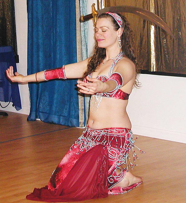 The evening opened with Zarifa performing a complex Taqsim drum solo, nailing every pop, slap and nuance with professional accuracy, followed by Devi Safir's veil dance to Egyptian style rhythms. Lani, one of Zarifa's former students, made a surprise appearance from San Diego with a sensual dance dedicated to Bastet, both technical and entertaining. Next up was Sihaya, with an eclectic mix of belly dance to oriental music, a reminder of the origins of belly dance as the "oriental dance." She was followed by Idena, Mahara and Zahara of Tasseled Camel. The first set ended in what can only be called a grand finale by Maia Alexandra in a dramatic sword dance, followed by an amazing display of belly work. Maia had a little more in store for us - toward the end of her set she coaxed - nay, dragged - spectators to the floor, inviting them to join in on the joy of belly dance. What a great way to end the first set!